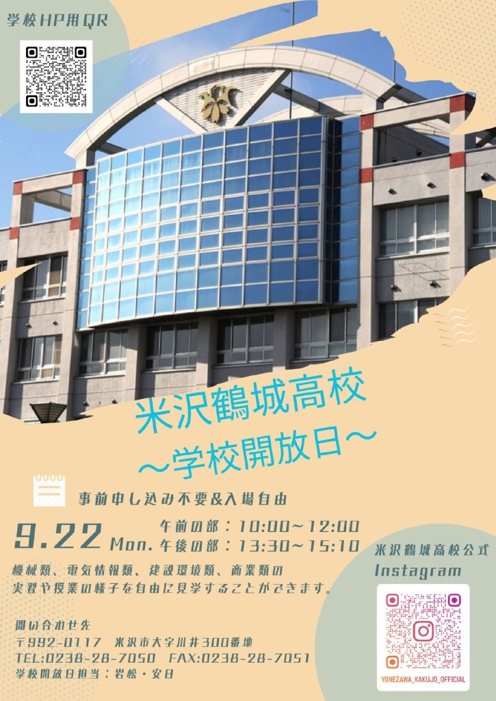 学校開放日 米沢鶴城高等学校 このイベントは終了しています。 イベント内容 イベント名学校開放日 開催日時9月22日(月)午前の部:10:00~12:00、午後の部:13:30~15:10 開催校米沢鶴城高等学校 開催場所米沢鶴城高校(米沢市川井300) 申込方法事前申し込み不要&入場自由 その他・備考米沢鶴城高校の機械類、電気情報類、建設環境類、商業類の実習や授業の様子を自由に見学することができます。 開催校の詳細を見る このイベントをシェアする パンフレット・資料